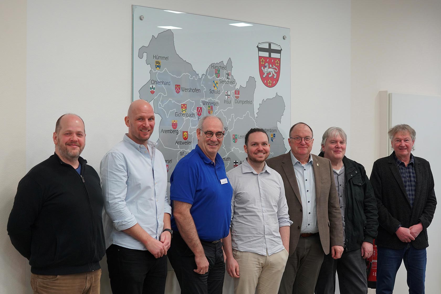 Robin Waldeck (Mitte) und Markus Parac (blaues Hemd links) von Sweco sowie die Steuerungsgruppe der Gemeindeverwaltung der Verbandsgemeinde Adenau