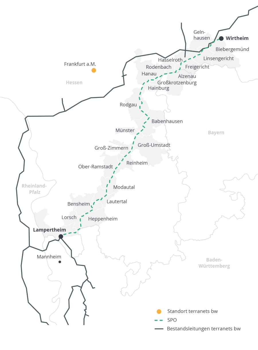 Die geplante Erdgastransportleitung SPO erstreckt sich über rund 117 Kilometer und durchquert das Bundesland Hessen und den Freistaat Bayern. Die Trasse orientiert sich weitgehend an dem Verlauf der bestehenden Mitte-Deutschland Anbindungs-Leitung (MIDAL). In Hessen und Bayern führt die SPO von Nord nach Süd durch die Landkreise Main Kinzig, Aschaffenburg, Offenbach, Darmstadt Dieburg und Bergstraße. Der Planfeststellungsbeschluss wird für Ende 2026 erwartet. Ab 2028 soll die SPO dann für den Gastransport eingesetzt werden.