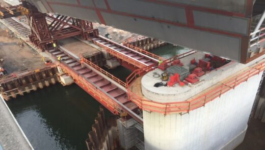 Einschwimmen Mittelteil und Anheben mit Litzenhebern (© Sweco GmbH, Alwin Dieter)