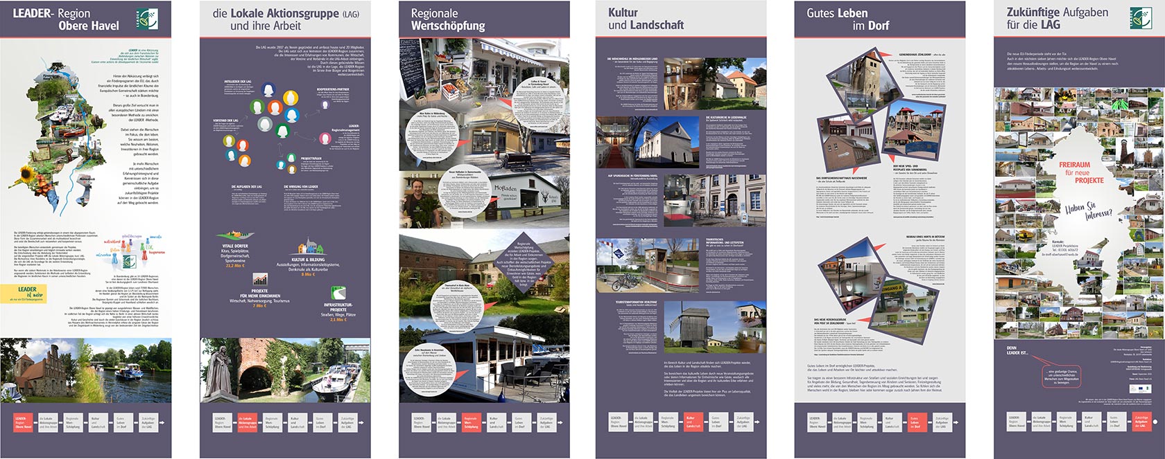 ![]() | In Vorbereitung der aktuellen Förderperiode hatte sich die Lokale Aktionsgruppe (LAG) entschlossen, die Ideen, Projekte und Aktionen aus sieben Jahren LEADER-Förderung in der Region Obere Havel zusammenzutragen und allgemeinverständlich darzustellen. Gleichzeitig war es wichtig, eine Brücke zur aktuellen EU-Förderperiode zu schlagen und die Menschen mit ihren Aufgaben in der LAG Obere Havel e.V. vorzustellen. Die Wanderausstellung wurde von der LAG zusammen mit einem Grafikbüro konzipiert und soll die Arbeit der LAG bekannter machen, die geleistete LEADER-Arbeit präsentieren und die engagierten Projektträger der LEADER-Region Obere Havel vorstellen. Aufgestellt an besuchten Orten/Gebäuden wendet sich der sternenförmige Aufsteller an die breite Öffentlichkeit und wirbt für den Gedanken der ländlichen Entwicklung von unten – bottom up als zentrales Merkmal der LEADER-Methode.
