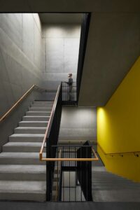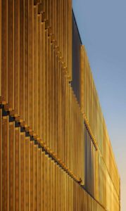 Die Westfassade der Halle B wurde komplett verglast und macht die MERGE Maschine nach außen sichtbar. Sie funktioniert wie ein Schaufenster. Damit bildet sie einen bewussten Kontrast zu den Fassaden der weiteren Gebäudeteile: Hier findet sich als gestalterisches Leitmotiv ein individuell gekantetes Aluminiumblech mit starker vertikaler Betonung wieder, das in einem warmen Bronzeton eloxiert wurde. Während diese Fassadenhülle der Halle A und C von außen einen geschlossenen Eindruck vermittelt, wirkt sie von innen aufgrund von feinen Lochstanzungen eher wie eine transparente Membran. Die Fassade des Laborgebäudes wurde zudem mit Lamellen ausgestattet, die sich nach Belieben und Sonnenstand ausrichten lassen. Hierdurch entsteht eine lebendige, sich immer neu zusammenfügende Fassadenstruktur. Die Fassade des Zentraleingangs erscheint wie ein gelochter Vorhang aus diesem Blech, der den Blick auf die Haupteingangstür freigibt.