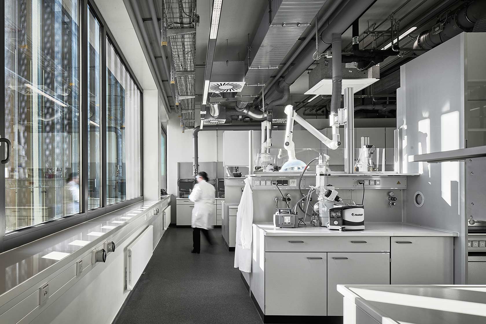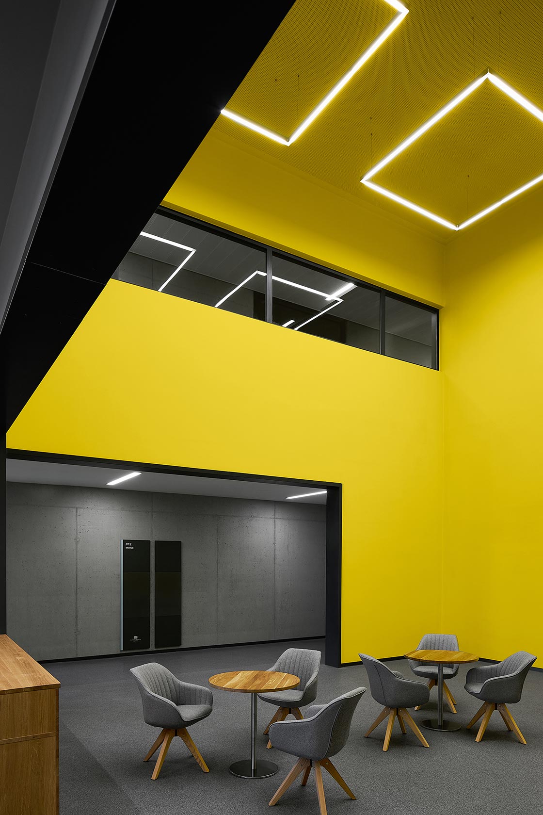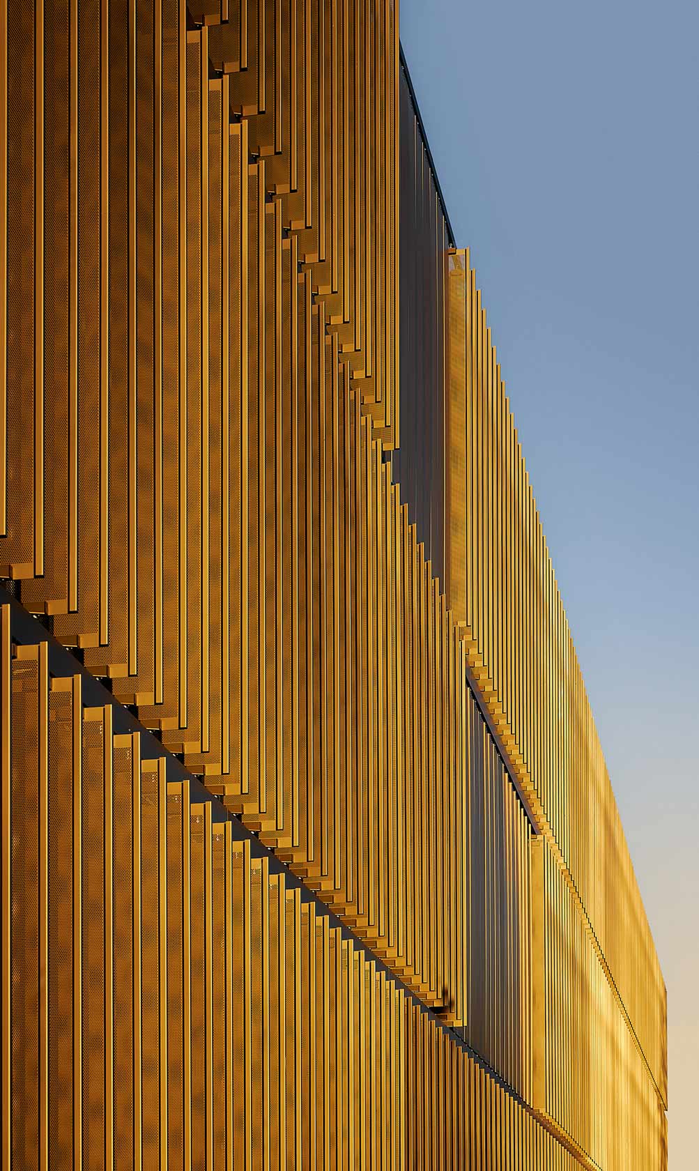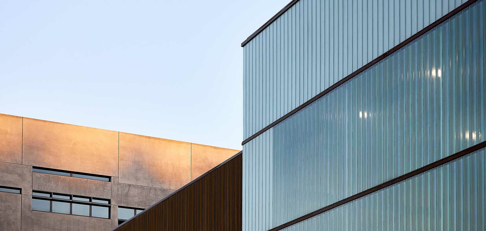 Die Westfassade der Halle B wurde komplett verglast und macht die MERGE Maschine nach außen sichtbar. Sie funktioniert wie ein Schaufenster. Damit bildet sie einen bewussten Kontrast zu den Fassaden der weiteren Gebäudeteile: Hier findet sich als gestalterisches Leitmotiv ein individuell gekantetes Aluminiumblech mit starker vertikaler Betonung wieder, das in einem warmen Bronzeton eloxiert wurde. Während diese Fassadenhülle der Halle A und C von außen einen geschlossenen Eindruck vermittelt, wirkt sie von innen aufgrund von feinen Lochstanzungen eher wie eine transparente Membran. Die Fassade des Laborgebäudes wurde zudem mit Lamellen ausgestattet, die sich nach Belieben und Sonnenstand ausrichten lassen. Hierdurch entsteht eine lebendige, sich immer neu zusammenfügende Fassadenstruktur. Die Fassade des Zentraleingangs erscheint wie ein gelochter Vorhang aus diesem Blech, der den Blick auf die Haupteingangstür freigibt.